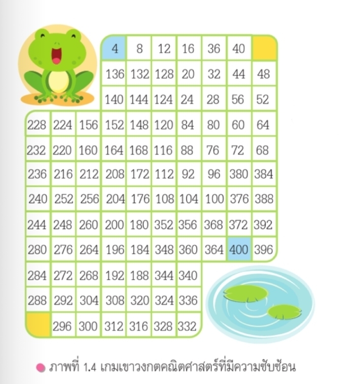 เกมอาจมีความซับซ้อนมากขึ้นอีก เช่น หาเส้นทางให้กบกระโดดไปยังสระน้ำ โดยเส้นทางนั้นจะเป็นการนับตั้งแต่ 4 ถึง 400 ซึ่งการนับแต่ละครั้งจะเพิ่มขึ้นครั้งละ 4