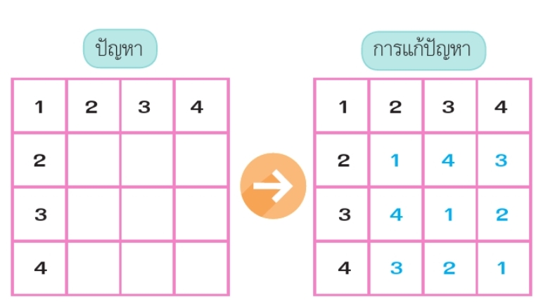 ตัวอย่าง ตัวเลขในช่องว่าง คือตัวเลขอะไร ถ้าทุกแถวในแนวนอนและแนวตั้งต้องมีตัวเลข 1 2 3 4 โดยตัวเลขในแต่ละแถวต้องบวกกันแล้วได้ผลลัพธ์เท่ากับ 10