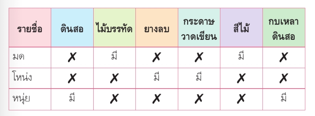 ตัวอย่าง มีนักเรียน 3 คน มด โหน่ง หนุ่ย แต่ละคนมีของอยู่ 2 อย่างที่ไม่ซ้ำกัน คือ ดินสอ ไม้บรรทัด ยางลบ กระดาษวาดเขียน สีไม้ และกบเหลาดินสอ แต่ไม่ทราบว่าใครเป็นเจ้าของอะไรบ้าง และเรามีข้อมูล ดังนี้