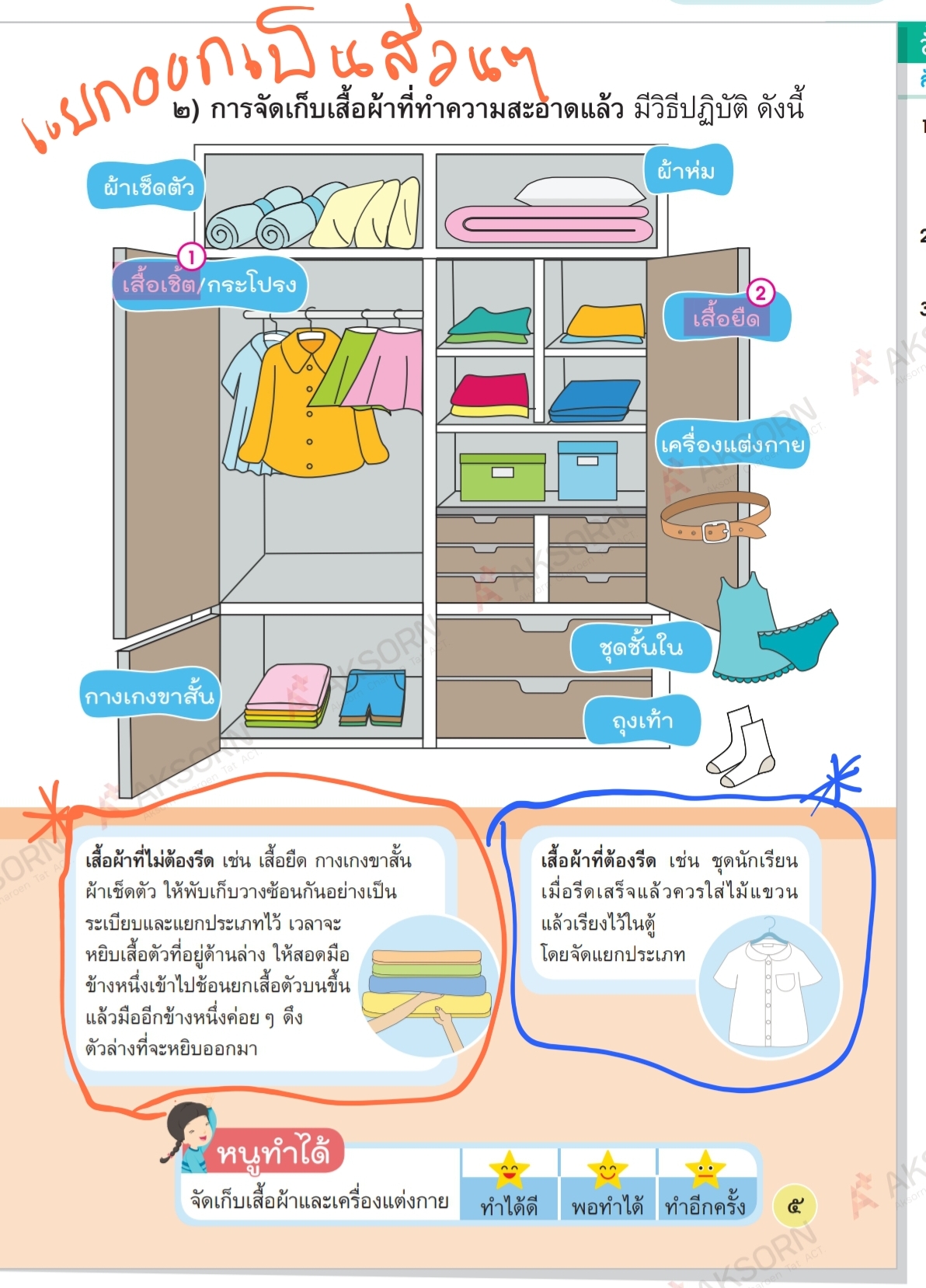 • เสื้อผ้าที่ต้องรีด เช่น ชุดนักเรียน ชุดทํางานเมื่อรีดเสร็จแล้วก็ควรนําใส่ไม่แขวนเสื้อและควรแขวนแยกประเภทของเสื้อผ้า เพื่อสะดวกในการเลือกมาสวมใส่หรือใช้งานต่อไป
