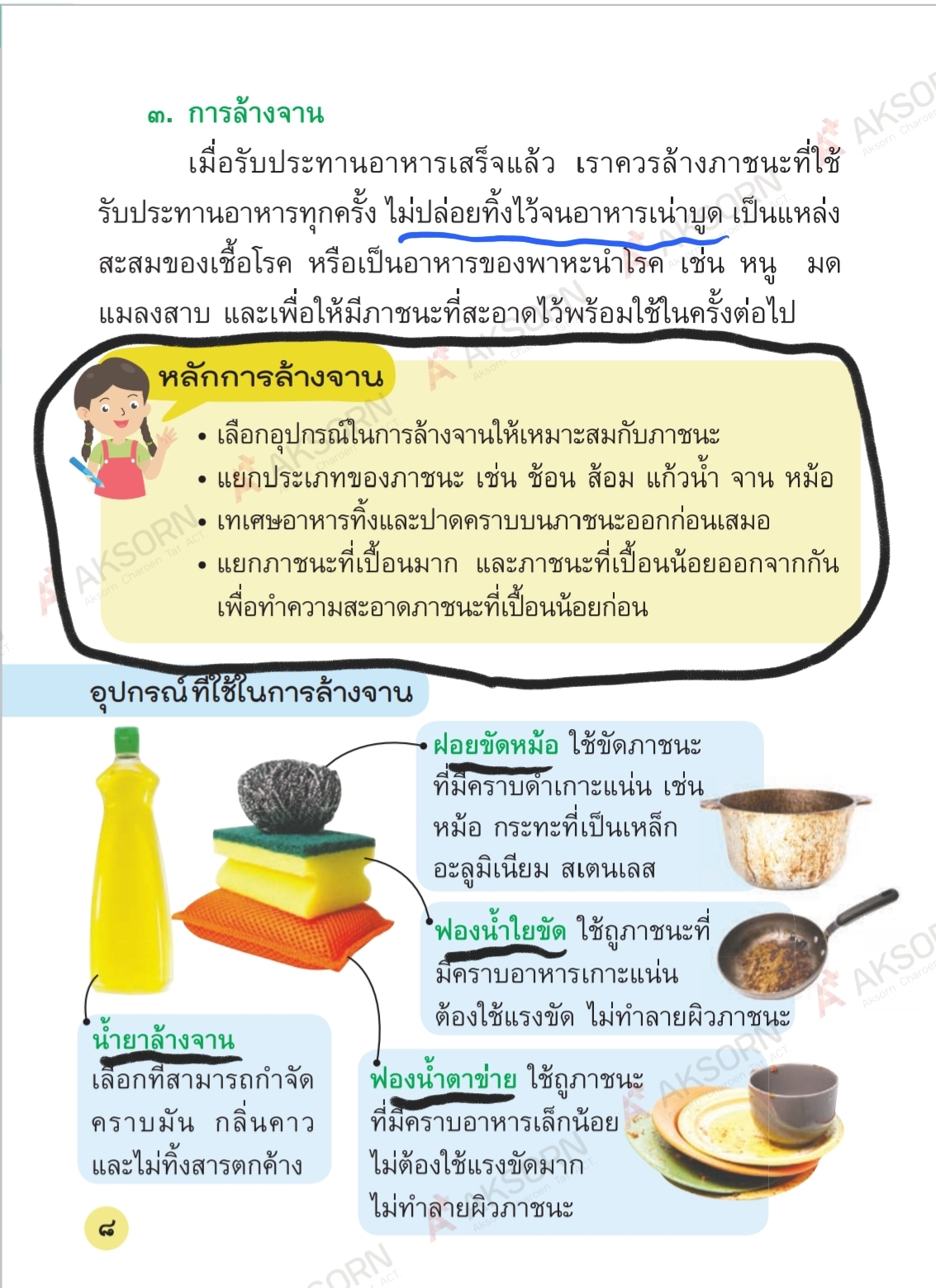 • นํ้ายาล้างจาน ใช้ทําความสะอาดคราบสกปรกไขมัน กลิ่นคาว บนภาชนะ สามารถใช้ร่วมกับฟองนํ้า ฝอยขัดหม้อ ฟองนํ้าใยขัดหรือฟองนํ้าตาข่าย โดยเทนํ้ายาลงบนฟองนํ้าที่