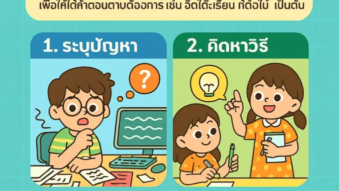 ในชีวิตประจำวันของพวกเรา ล้วนเต็มไปด้วยปัญหาเล็กบ้างใหญ่บ้าง เช่น โต๊ะเรียนรก เดินทางไปโรงเรียนไม่ทันเวลา หรือซื้อของไม่ครบรายการ ซึ่งหากเรามี “ลำดับขั้นตอนการแก้ปัญหา” ที่ชัดเจน ก็จะช่วยให้เราจัดการสิ่งเหล่านี้ได้อย่างมีระบบและมีประสิทธิภาพมากขึ้น