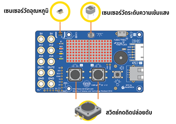 สำหรับบอร์ด KidBright มีเซนเซอร์ที่ติดตั้งมาบนบอร์ดพร้อมใช้งาน ประกอบด้วย เซนเซอร์วัดระดับความเข้มแสง เซนเซอร์วัดอุณหภูมิ และสวิตช์กดติดปล่อยดับ