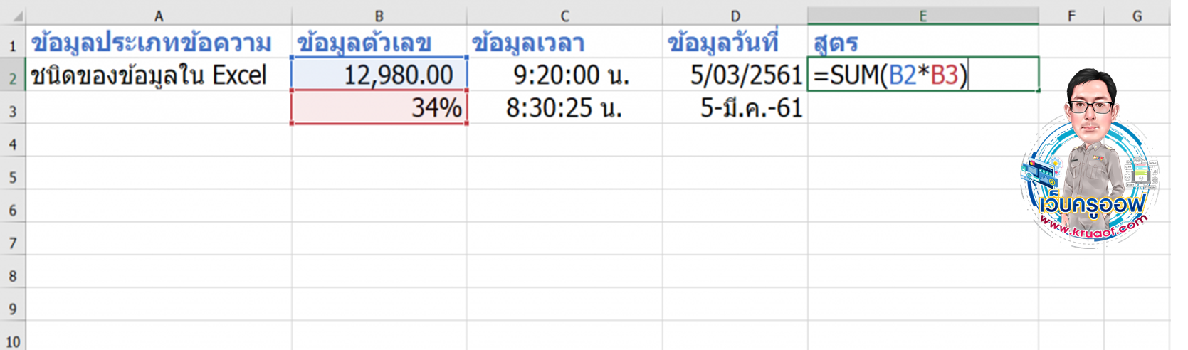 ประเภทของข้อมูล (Data Type) ที่ใช้ในโปรแกรม Microsoft Excel 2016 มี ดังนี้