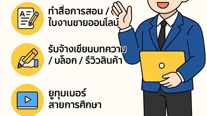 - ถนัดงานเขียน หรืออยากแบ่งปันประสบการณ์การสอน สามารถรับจ้างเขียนบทความหรือรีวิวสินค้า/แอปการศึกษาให้กับเว็บหรือเพจต่าง ๆ ได้