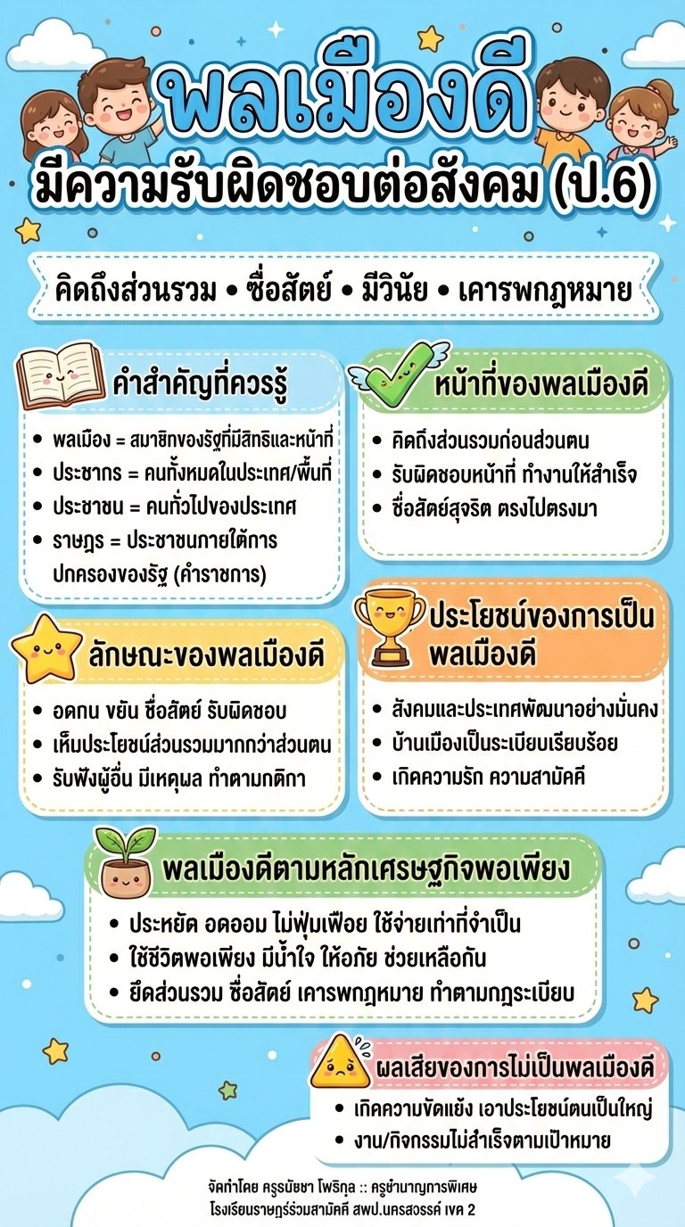 พลเมืองที่ดีไม่ใช่เพียงการรู้สิทธิของตนเองเท่านั้น แต่ต้องมี ความรับผิดชอบต่อสังคม เคารพกฎหมาย กติกา มีส่วนร่วมในการดูแลส่วนรวม และไม่สนับสนุนหรือเพิกเฉยต่อการทุจริต การปลูกฝังความเป็นพลเมืองที่เข้มแข็งจะช่วยสร้างสังคมที่โปร่งใสและเป็นธรรม