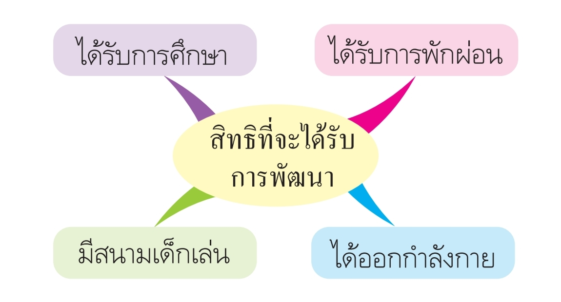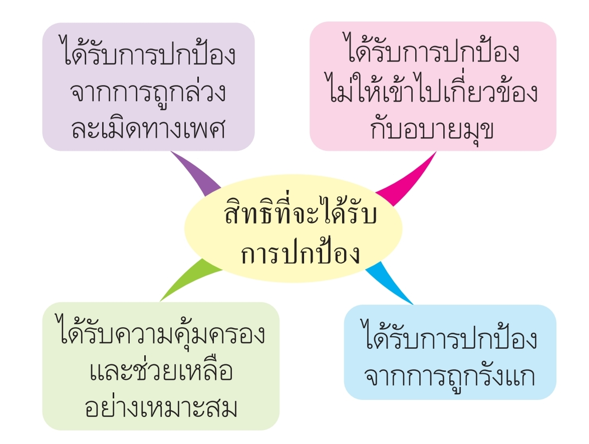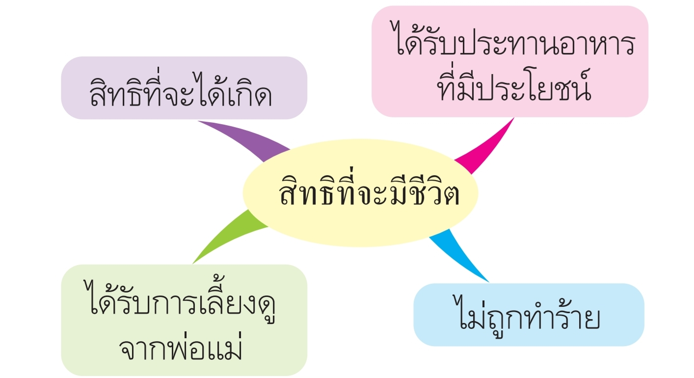 สิทธิของเด็กที่สำคัญมี 4 ประการ ครอบคลุม (1)สิทธิที่จะมีชีวิต (2) สิทธิที่จะได้รับการปกป้อง (3) สิทธิที่จะได้รับการพัฒนา และ (4) สิทธิที่จะมีส่วนร่วม