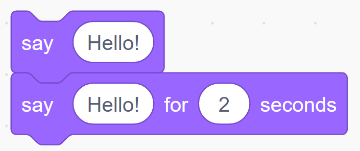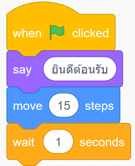 หากเราต้องการให้ตัวละครในเกมพูด ทักทาย หรือเคลื่อนไหว เราต้อง “เขียนโปรแกรม” เพื่อสั่งให้มันทำสิ่งเหล่านั้นอย่างเป็นลำดับ ซึ่งจะใช้คำสั่งต่าง ๆ ใน Scratch เช่น say, move, และ wait