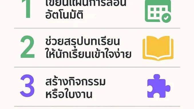 เพียงใส่หัวข้อ + ระดับชั้น → ChatGPT สามารถร่างแผนการสอน พร้อมจุดประสงค์ กิจกรรม และวิธีการประเมินผลได้ในไม่กี่วินาที