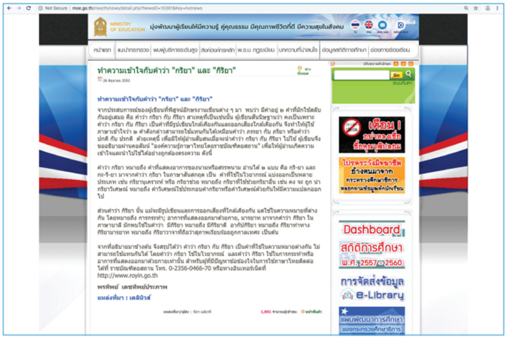 - จากภาพจะเห็นว่าเมื่อเข้าไปในเว็บไซต์จะพบข้อมูลมากมาย ซึ่งเว็บไซต์กระทรวงศึกษาธิการเป็นเว็บไซต์ที่มีความน่าเชื่อถือ เนื่องจากเป็นเว็บไซต์องค์กรรัฐบาล และมีผู้เชี่ยวชาญในการเรียบเรียงข้อมูล แต่นักเรียนควรศึกษาข้อมูลจากเว็บไซต์อื่นๆ ด้วยเพื่อใช้ในการเปรียบเทียบข้อมูล
