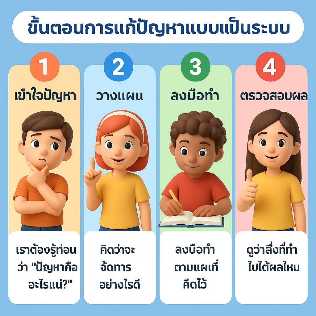 เมื่อเราเจอปัญหา ไม่ว่าจะเล็กน้อยอย่าง “ลืมสมุดการบ้าน” หรือซับซ้อนอย่าง “ทำโปรเจกต์กลุ่มแล้วเพื่อนขาดความร่วมมือ” สิ่งสำคัญที่สุดคือ ไม่ควรรีบตัดสินใจด้วยอารมณ์ แต่ควร “คิดอย่างเป็นระบบ” เพื่อหาทางแก้ไขอย่างมีประสิทธิภาพ