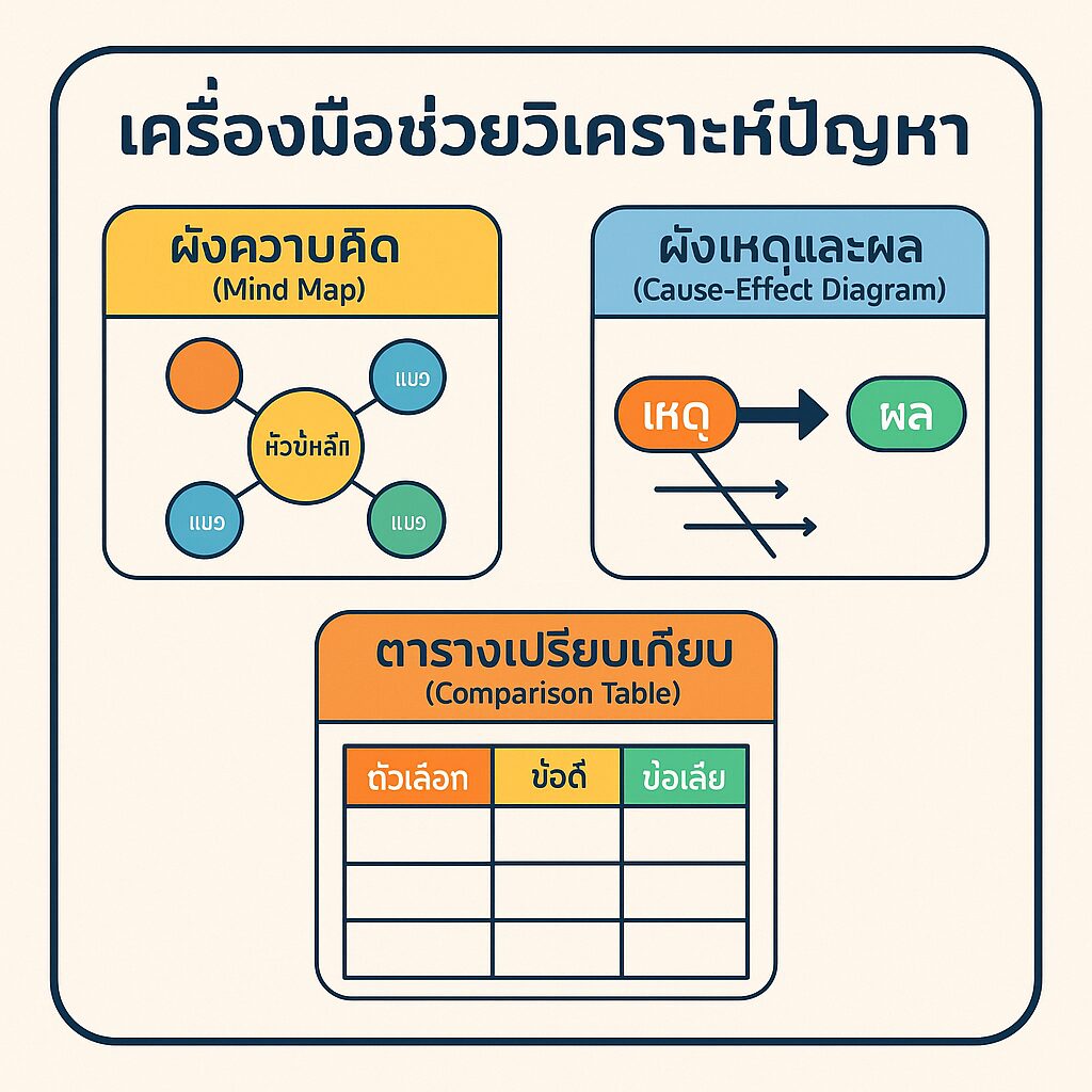 การแก้ปัญหาที่ดีไม่ใช่แค่คิดด้วยสมองเท่านั้น แต่การ “วาดภาพ” หรือ “จัดระบบความคิด” ออกมาให้เห็นชัดเจนจะช่วยให้เราเข้าใจปัญหาง่ายขึ้น และเลือกวิธีแก้ไขได้อย่างมีประสิทธิภาพ