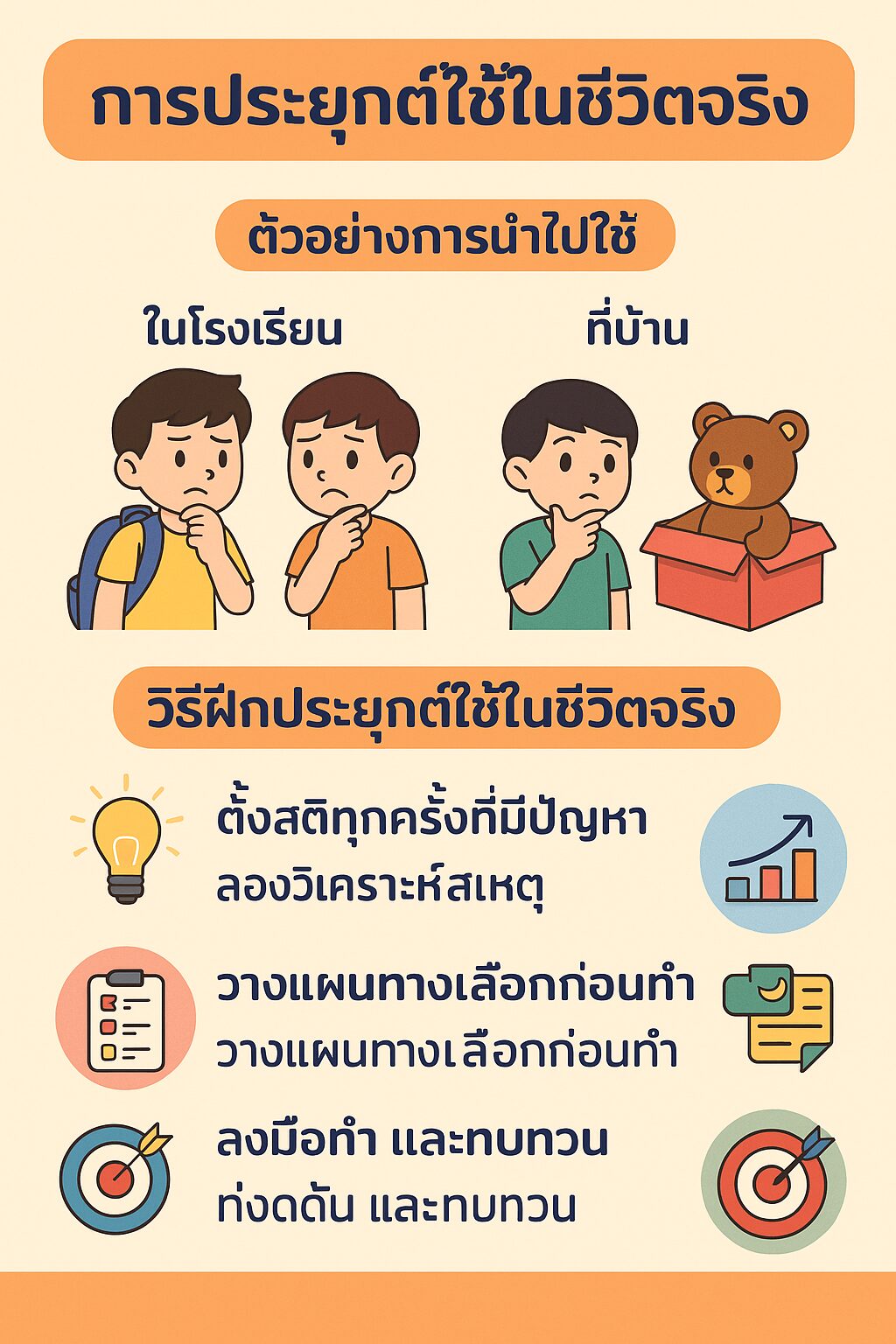 เมื่อเราเรียนรู้การใช้เหตุผล การคิดวิเคราะห์ และการแก้ปัญหาอย่างเป็นระบบแล้ว สิ่งสำคัญที่สุดคือ การนำไปใช้จริงในชีวิตประจำวัน เพราะความรู้จะมีประโยชน์ก็ต่อเมื่อ “ได้ลงมือใช้”