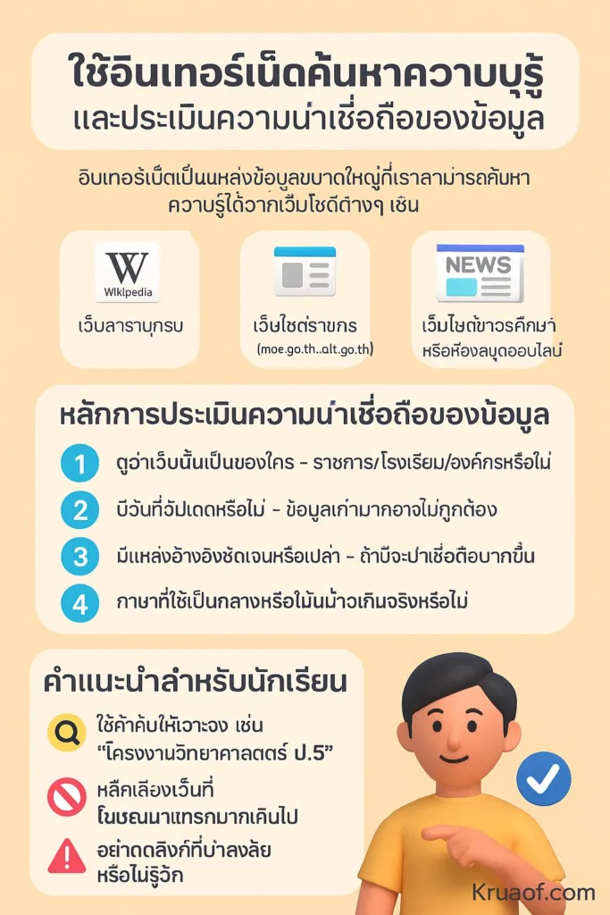 การใช้อินเทอร์เน็ตและเทคโนโลยีอย่างปลอดภัยเป็นทักษะจำเป็นในยุคดิจิทัล เด็ก ๆ ควรเรียนรู้การ ค้นหาความรู้ด้วยวิธีที่ถูกต้อง, คิดอย่างมีวิจารณญาณ และ ใช้อย่างมีจริยธรรม เพื่อให้สามารถเติบโตอย่างปลอดภัยในโลกออนไลน์