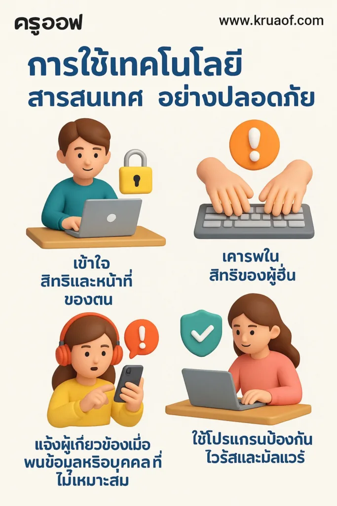 การใช้เทคโนโลยีสารสนเทศอย่างปลอดภัย เข้าใจสิทธิและหน้าที่ของตน เคารพในสิทธิ ของผู้อื่น เช่น ไม่สร้างข้อความเท็จและส่งให้ผู้อื่น ไม่สร้างความเดือดร้อนต่อผู้อื่นโดยการส่งสแปม ข้อความลูกโซ่ ส่งต่อโพสต์ที่มีข้อมูลส่วนตัวของผู้อื่น ส่งคำเชิญเล่นเกม ไม่เข้าถึงข้อมูลส่วนตัวหรือ การบ้านของบุคคลอื่นโดยไม่ได้รับอนุญาต ไม่ใช้เครื่องคอมพิวเตอร์/ชื่อบัญชีของผู้อื่น การสื่อสารอย่างมีมารยาทและรู้กาลเทศะ
