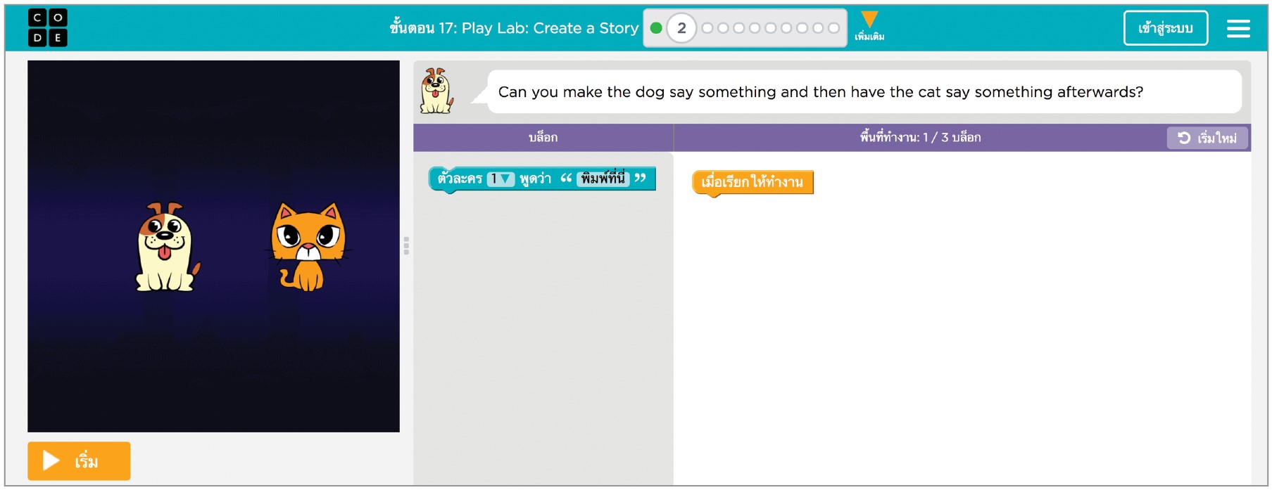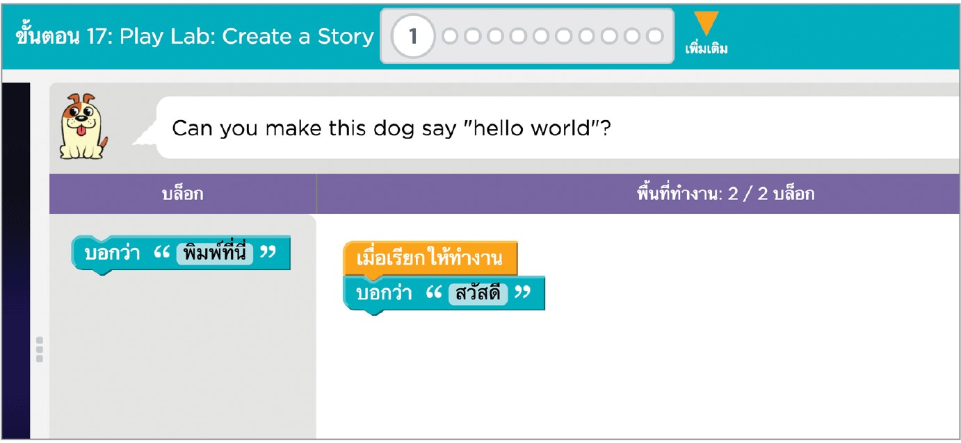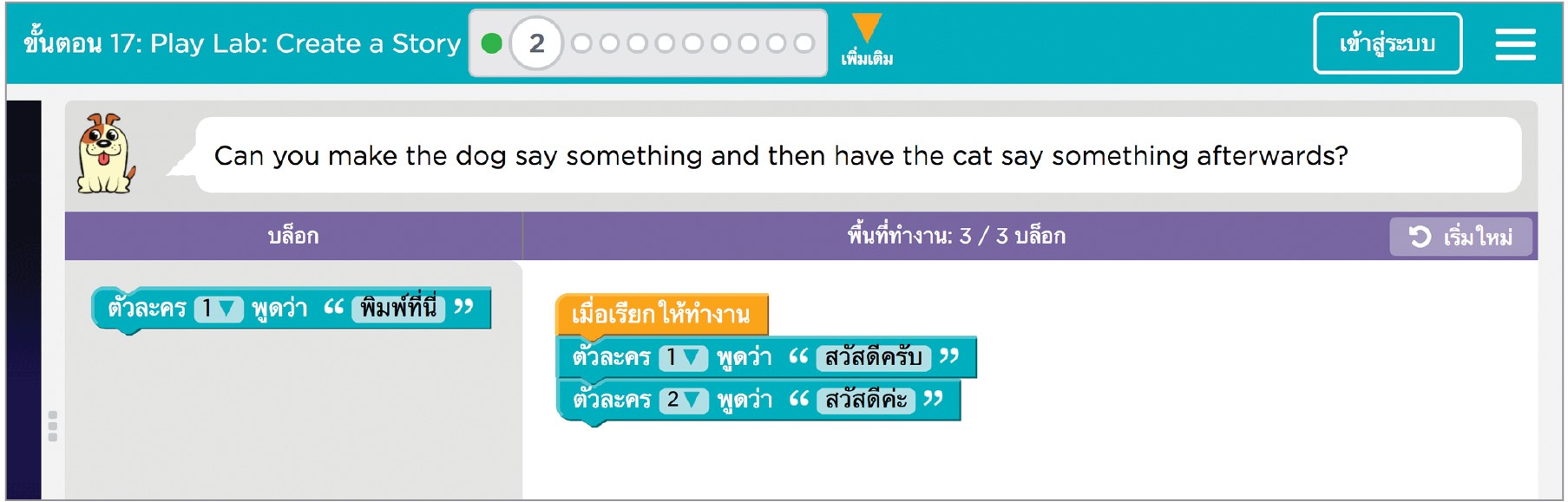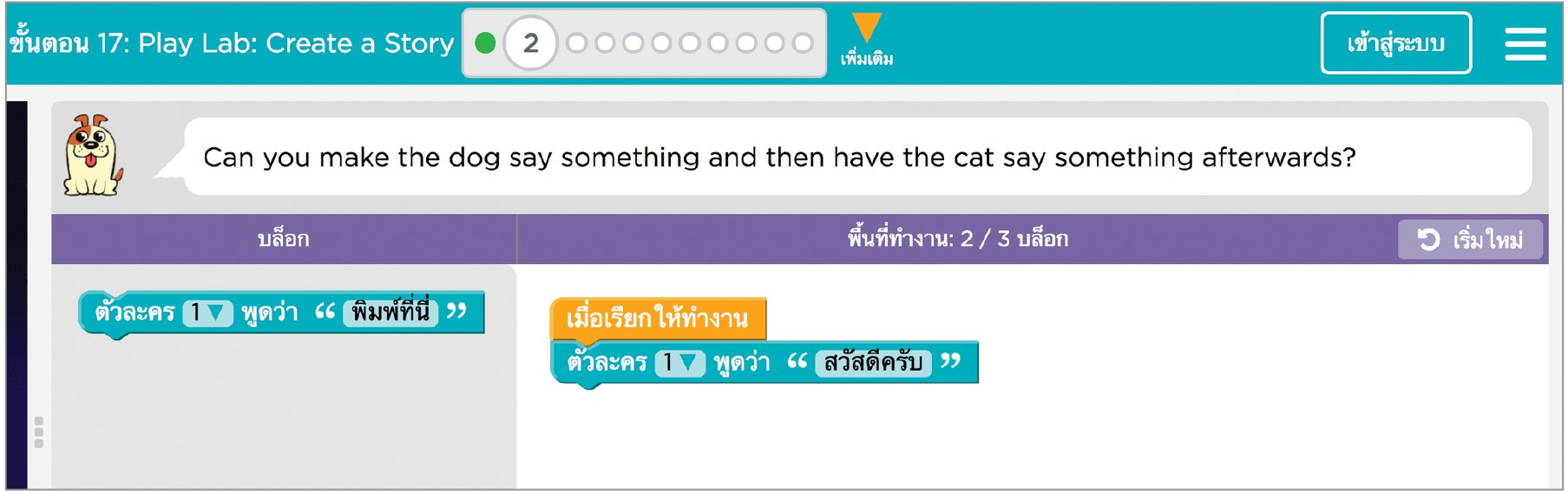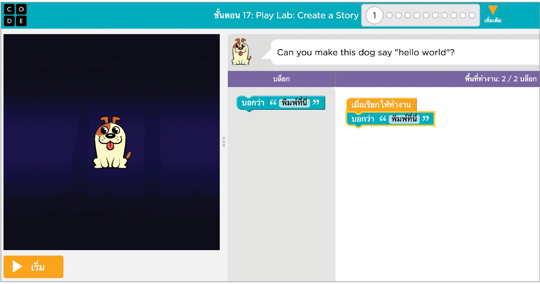 1. คลิกเมาส์เลือกบทเรียนลำดับที่ 17 Play Lab: Create a Story แล้วคลิกเมาส์เลือกข้อ 1