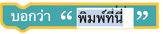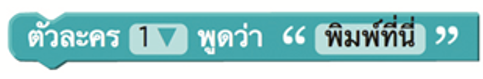 1. เขียนโปรแกรมให้ตัวละครสื่อสาร โดยคลิกเมาส์ลากบล็อกคำสั่ง 00000.jpg มาวางตรงพื้นที่ทำงาน