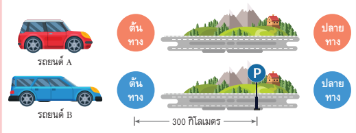 รถยนต์ A วิ่งด้วยความเร็ว 50 กิโลเมตรต่อชั่วโมง รถยนต์ B วิ่งด้วยความเร็ว 100 กิโลเมตรต่อชั่วโมง ระยะทางจากต้นทางไปถึงปลายทางของรถยนต์ทั้ง 2 คันเท่ากัน คือ 400 กิโลเมตร และเส้นทางของรถยนต์ B มีจุดจอด P โดยรถยนต์ทุกคันที่ผ่านจุดนี้จะต้องจอดเป็นเวลา 1 ชั่วโมง การหาเวลาที่รถยนต์ทั้ง 2 คัน ต้องเดินทางจากต้นทางไปยังปลายทางจะทำได้ดังนี้