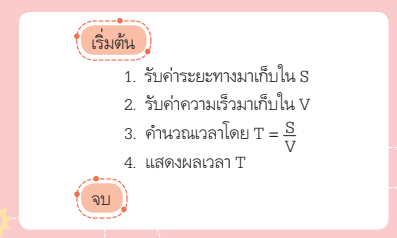 ในการออกแบบโปรแกรมนั้นจะต้องรับข้อมูลทั้ง 2 ค่าเข้ามาเก็บในหน่วยความจำของคอมพิวเตอร์และเมื่อประมวลผลจะเก็บไว้ในหน่วยความจำเช่นกัน โดยข้อมูลต่าง ๆ จะเก็บไว้ในตัวแปร ถ้าให้ตัวแปร S แทนระยะทาง ตัวแปร V แทนความเร็วและตัวแปร T แทนเวลา การประมวลผลสามารถเขียนวิธีการได้ดังนี้