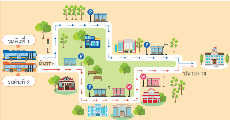 รถประจำทาง 2 คัน ต้องเดินทางจากต้นทางไปยังปลายทาง มีระยะทางเท่ากัน คือ 180 กิโลเมตร โดยจะใช้คนละเส้นทางกัน ในแต่ละเส้นทางจะมีจุดจอด P รถต้องจอด 20 นาที และจุดจอด W รถต้องจอด 15 นาที รถคันที่ 1(เส้นทางสีน้ำเงิน) วิ่งด้วยความเร็ว 60 กิโลเมตรต่อชั่วโมง รถคันที่ 2 (เส้นทางสีแดง) วิ่งด้วยความเร็ว 90 กิโลเมตรต่อชั่วโมง โดยมีเส้นทาง ดังภาพ