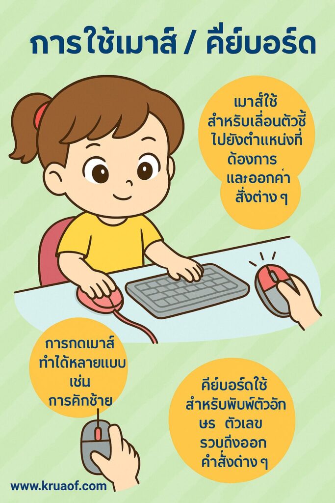 ภาพนี้แสดงให้เห็นการเรียนรู้การใช้งานเมาส์และคีย์บอร์ดอย่างง่าย เด็กสามารถเรียนรู้การใช้เมาส์เพื่อเลื่อนตัวชี้และออกคำสั่งต่าง ๆ รวมถึงการคลิกซ้ายและขวา ส่วนคีย์บอร์ดใช้สำหรับพิมพ์ตัวอักษร ตัวเลข และคำสั่งอื่น ๆ โดยเนื้อหาถูกนำเสนออย่างเข้าใจง่าย พร้อมภาพประกอบสีสันสดใส เหมาะกับนักเรียนระดับประถมศึกษา เพื่อเสริมสร้างทักษะพื้นฐานด้านการใช้คอมพิวเตอร์