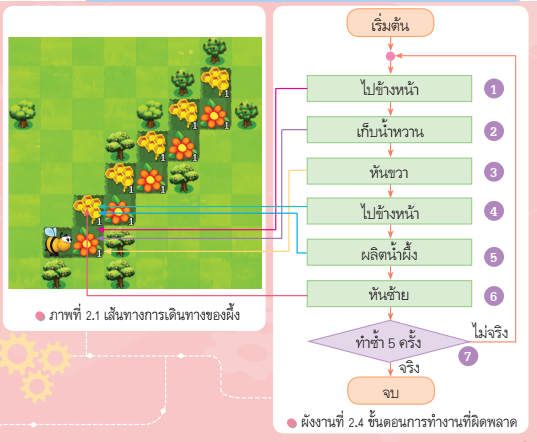 นักเรียนต้องการเขียนโปรแกรม ให้ผึ้งเดินทางไปเก็บน้ำหวาน และผลิตน้ำผึ้ง โดยการทำงานแบบวนซ้ำ แต่โปรแกรมทำงานผิดพลาด นักเรียนต้องหาข้อผิดพลาด โดยตรวจสอบการทำงาน ทีละคำสั่ง หรือตรวจสอบ จากอัลกอริทึมทีละขั้นตอน ดังนี้