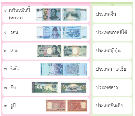 เงินที่ใช้กันอยู่ในแต่ละประเทศ เป็นสิ่งที่มีค่ามาตรฐาน ใช้ชำาระหนี้ได้ตามกฎหมาย ใช้เป็นสื่อกลางในการแลกเปลี่ยนและใช้เป็นหน่วยวัดมูลค่า เช่น วัดมูลค่าของรายได้และค่าใช้จ่าย เป็นหน่วยเงินตราที่แต่ละประเทศกำาหนดขึ้นเพื่อใช้ภายในประเทศเรียกว่า เงินตราในประเทศ ส่วนเงินตราสกุลอื่นที่ไม่ใช่เงินตราที่ใช้อยู่ในประเทศเรียกว่า เงินตราต่างประเทศ