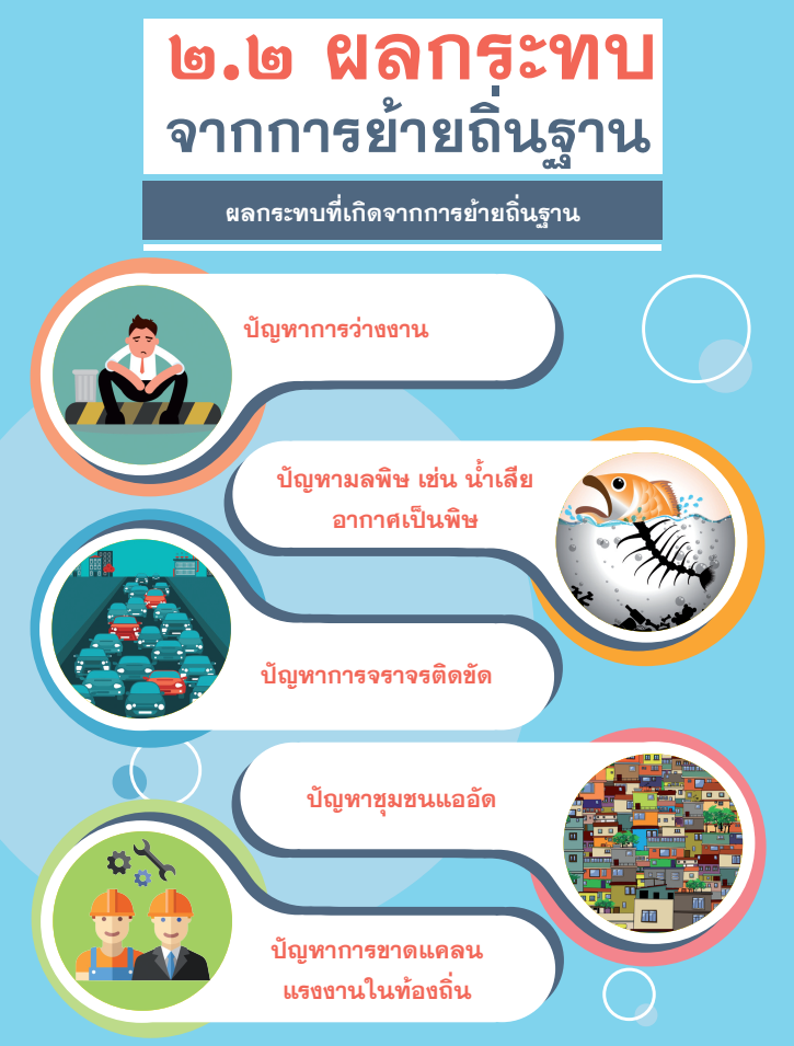 - สภาพเศรษฐกิจที่เปลี่ยนแปลง เป็นแรงผลักดันทำาให้เกิดการย้ายถิ่นฐานออกจากพื้นที่เดิม ไปสู่เมืองใหญ่ที่มีแนวโน้มการขยายตัวทางเศรษฐกิจภาคอุตสาหกรรม การค้า และบริการเพิ่มขึ้น