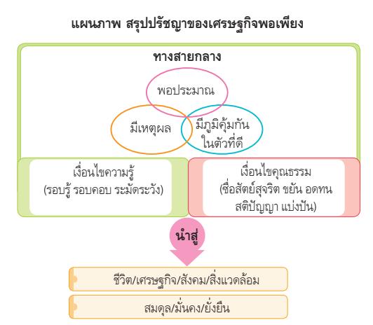 2.2 เงื่อนไขคุณธรรม ประกอบด้วย การมีความซื่อสัตย์สุจริตมีความอดทน มีความขยันหมั่นเพียร ใช้สติปัญญาในการดำเนินชีวิตไม่โลภ และแบ่งปันให้ผู้อื่นตามความเหมาะสม