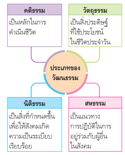 ประเภทของวัฒนธรรม วัฒนธรรมแบ่งออกเป็น 4 ประเภท ครอบคลุม (1) คติธรรม (2) วัตถุธรรม (3) นิติธรรม และ (4) สหธรรม