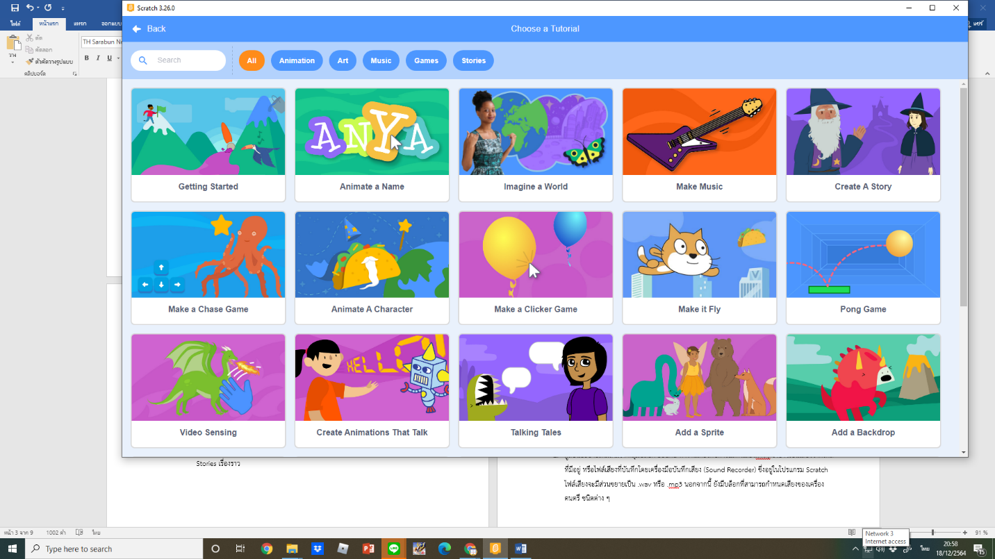 ในโปรแกรม Scratch จะมี Tutorials คือ บทเรียน Scratch เป็นการฝึกเขียนสคริปต์ ตามวิดีโอแนะนำจากโปรแกรม Scratch วิธีการใช้งาน คือ เข้าไปที่ ไอคอน Tutorials จะปรากฏหน้าต่าง ให้เลือกใช้งาน