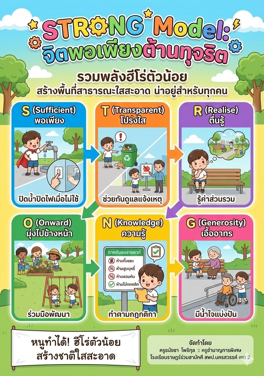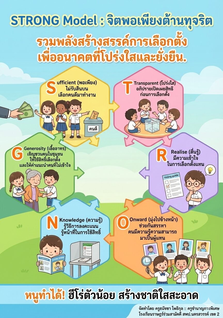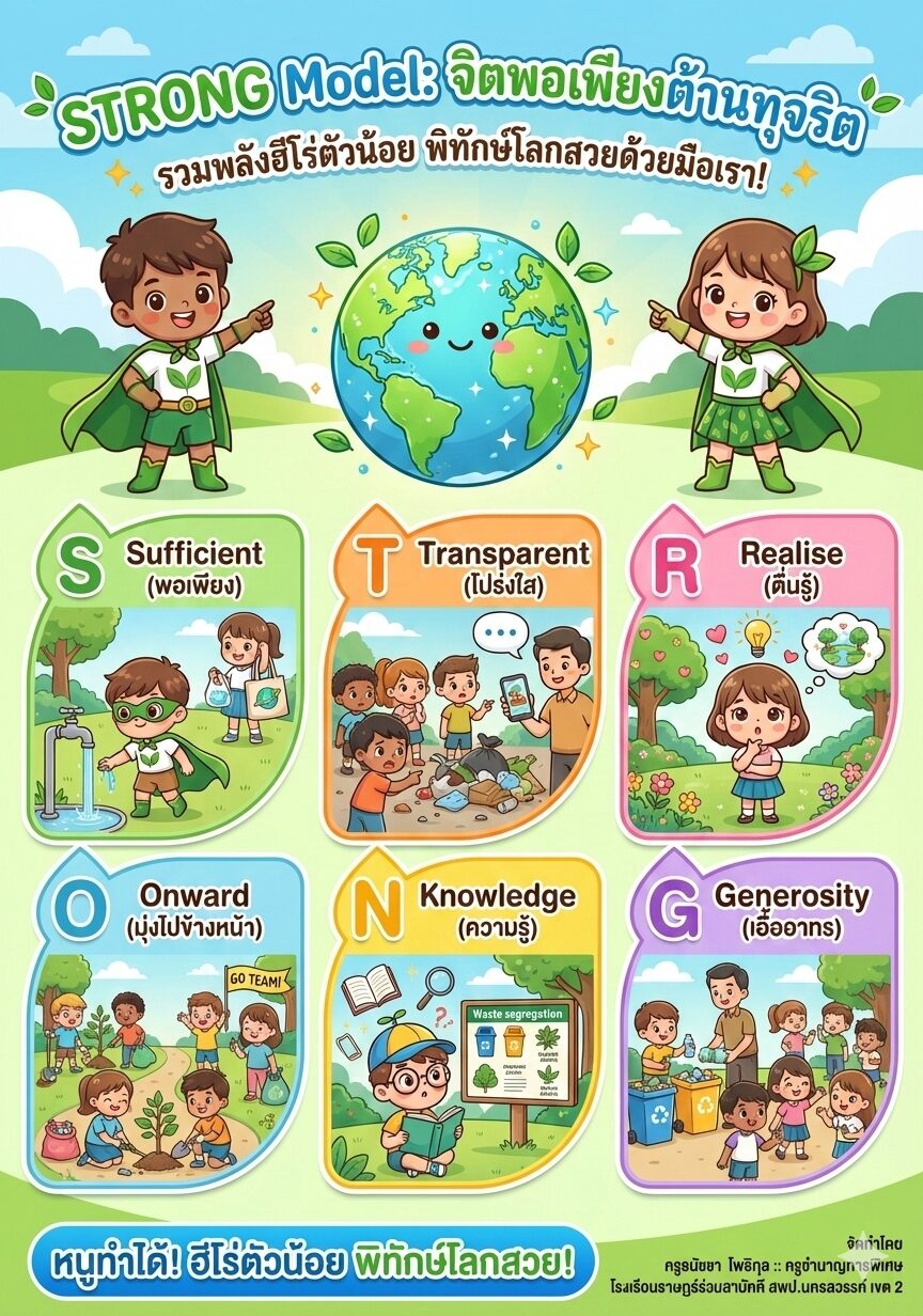 “คนที่มีจิตพอเพียงต่อต้านทุจริต คือคนที่ใช้ชีวิตด้วยความซื่อสัตย์ พอประมาณ มีเหตุผล และไม่ยอมทำสิ่งผิด แม้ไม่มีใครเห็น เพราะเขามีจิตใจที่เข้มแข็ง — STRONG จริง ๆ”