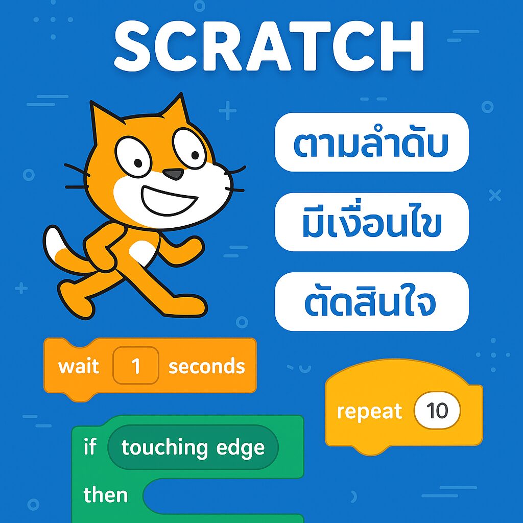 รู้จักส่วนประกอบ Scratch ประเภทบล็อก คำสั่งพื้นฐาน แนวคิดลำดับคำสั่ง (Sequence) เหตุการณ์ (Events) การทำซ้ำ (Loops) และเงื่อนไข (Condition) พร้อมกิจกรรม/ใบงานและแบบทดสอบ 15 ข้อ