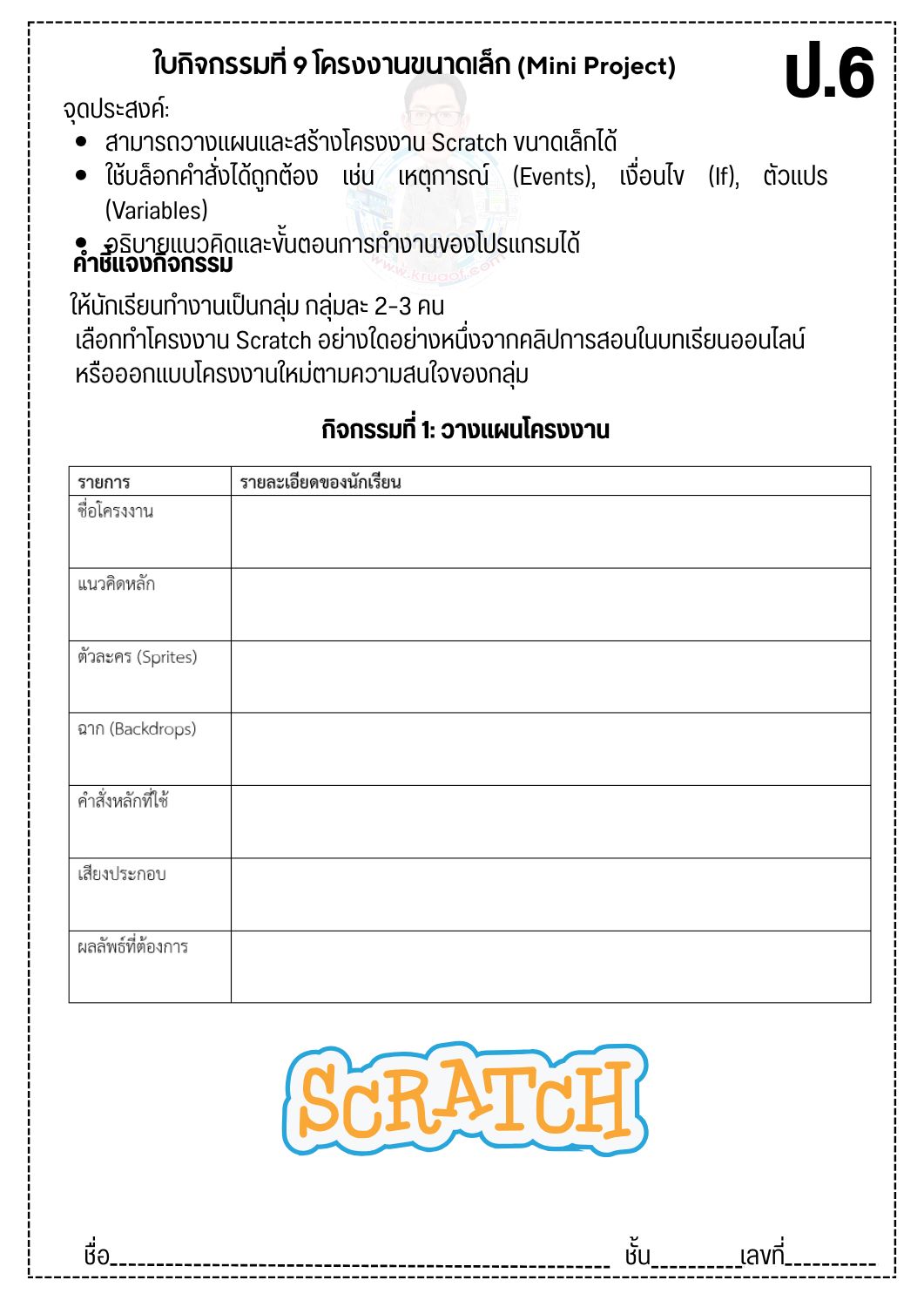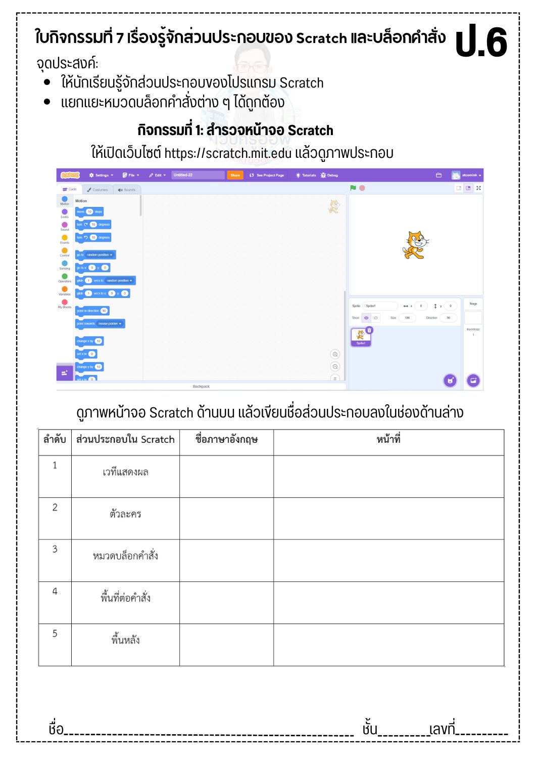 • ใบงานที่ 7: รู้จักส่วนประกอบของ Scratch และบล็อกคำสั่ง